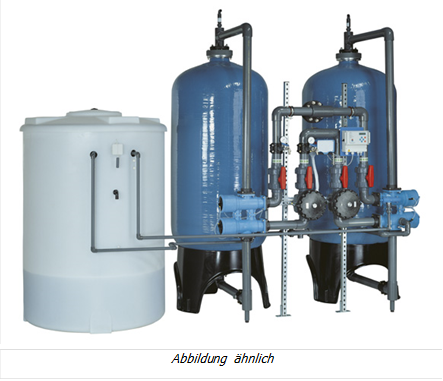 2 Austauscherbehälter aus GFK mit Ionenaustauscherharz in Säcken zur bauseitigen Befüllung.